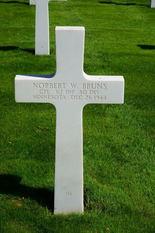 Cpl Norbert W. Bruns enlisted on 17 December 1942.He was awarded the Silver Star Medal posthumously. The citation cited: On 25 December 1944, in the attack on Kehmen, Luxembourg, Cpl Bruns, by skillfully using rifle grenades, neutralized enemy strong points and personally captured an enemy machine gunner who had been delaying the attack. On the following day Cpl Bruns with rifle grenades destroyed two enemy machine gun positions and alone assaulted and destroyed another gun and crew.