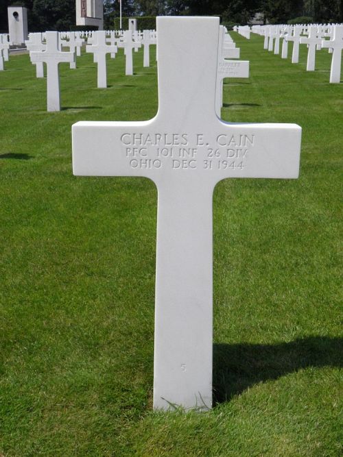 Pfc Charles E. Cain was a welder and flame cutter at the United Welding Company before he enlisted at Fort Thomas, Kentucky on 25 April 1944.He was killed by artillery shell fragments.