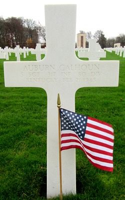 S/Sgt Auburn Calhoun worked on a farm before he enlisted in Huntington, West Virginia on 21 July 1943.Source of information: Leo Minne, www.abmc.gov, www.wwiimemorial.com, www.ancestry.com – 1930/1940 Census / Headstone and Interment Record / Brown Family Tree / Kentucky Birth Index, www.80thdivision.com