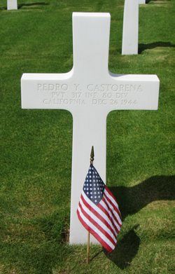 Pvt Pedro Y. Castorena was employed by the California Portland Cement Company.He enlisted at Fort MacArthur, California on 1 June 1944 and was sent overseas in November 1944.