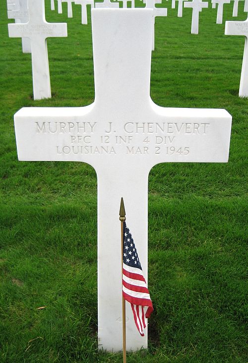 Pfc Murphy J. Chenevert worked on a farm before he enlisted at Jacksonville Army Airfield, Florida on 21 February 1941.Source of information: Peter Schouteten, Danny van der Groen – Company’s / 4ID After Action Reports, www.abmc.gov, www.wwiimemorial.com, www.archives.gov – WWII Enlistment Record, www.ancestry.com - Headstone and Interment Record / Karen M. Crochet Family Tree / 1940 Census, www.findagrave.com