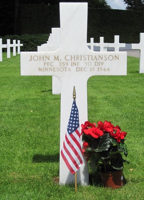 Pfc John M. Christianson enlisted on 14 November 1942 at Fort Snelling and was sent overseas in March 1944 he was sent overseas.Source of information: Peter Schouteten, Carla Mans, www.abmc.gov, www.wwiimemorial.com, www.ancestry.com - Headstone and Interment Record / 1920 Census / U.S. WWII Draft Cards Young Men, www.newspapers.com - Wilmar Weekly Tribune - 13 June 1945