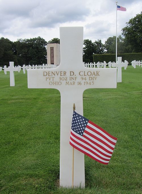 Pvt Denver D. Cloak worked on a farm before he enlisted in Fort Benjamin Harrison, Indiana on 5 June 1944.Source of information: Peter Schouteten, www.abmc.gov, www.wwiimemorial.com, www.archives.gov - WWII Enlistment Record, www.ancestry.com - Headstone and Interment Record / Preisendefer Family Tree / 1930 Census, http://www.94thinfdiv.com, www.findagrave.com - Bonnie