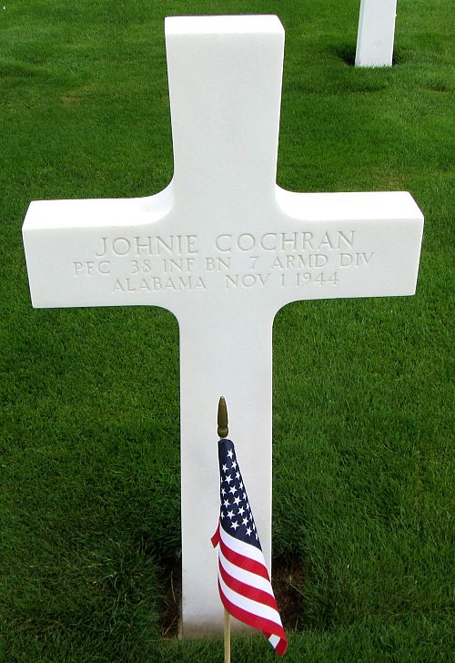 Pfc Johnie Cochran enlisted at Camp Shelby, Mississippi on 9 March 1942.Source of information: André Koch, www.abmc.gov, www.wwiimemorial.com, www.archives.gov - WWII Enlistment Record, www.ancestry.com - 1920/1930/1940 Census / Headstone and Interment Record / U.S. WWII Draft Cards Young Men, www.7tharmddiv.org