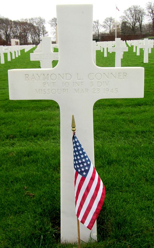 Pvt Raymond L. Conner was a trader before he enlisted at Jefferson Barracks, Missouri on 27 April 1944.Source of information: Leo Minne, www.abmc.gov, www.wwiimemorial.com, www.archives.gov – WWII Enlistment Record, www.ancestry.com - 1930/1940 Census / Headstone and Interment Record, A footsoldier for Patton / Michael C. Bilder James G. Bilder, The 5th Infantry division in the ETO