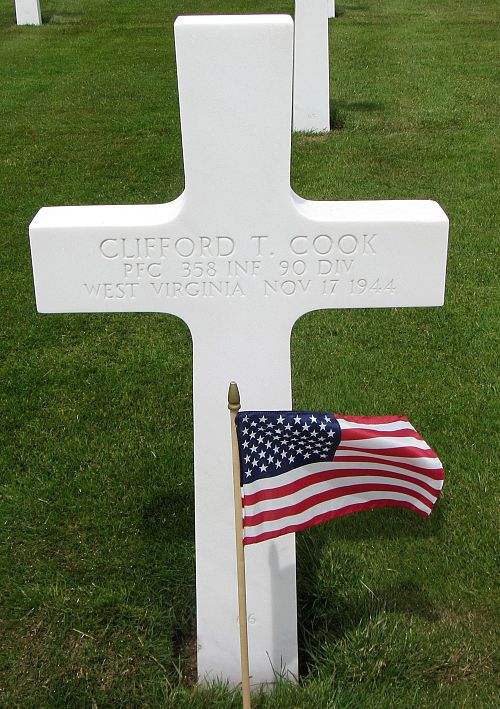 Pfc Clifford T. Cook enlisted in Huntington, West Virginia on 8 January 1944.Source of information: Peter Schouteten, www.abmc.gov, www.wwiimemorial.com, www.archives.gov – WWII Enlistment Record, www.ancestry.com - Headstone and Interment Record / 1920/1930/1940 Census / U.S. WWII Draft Cards Young Men / WWII Young American Patriots