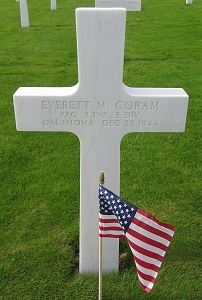Pfc Everett M. Coram worked on a farm before he enlisted in Los Angeles, California on 24 August 1942.He was wounded in the hip in July 1944 and spent three months in a hospital in France, after which he rejoined his unit.