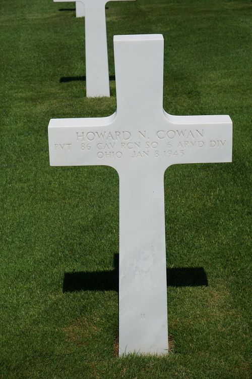 Pvt Howard N. Cowan was a graduate of Withrow High School. He was an elevator operator before he enlisted in Cincinnati, Ohio on 6 January 1943. He was sent overseas in September 1944.Without any tank support, B Troop was ordered to attack a dug-in German position in the woods east and just south of Bastogne. The attack failed and it suffered ten men killed and seventeen wounded. Eventually it took a much stronger force to drive the enemy from the woods.