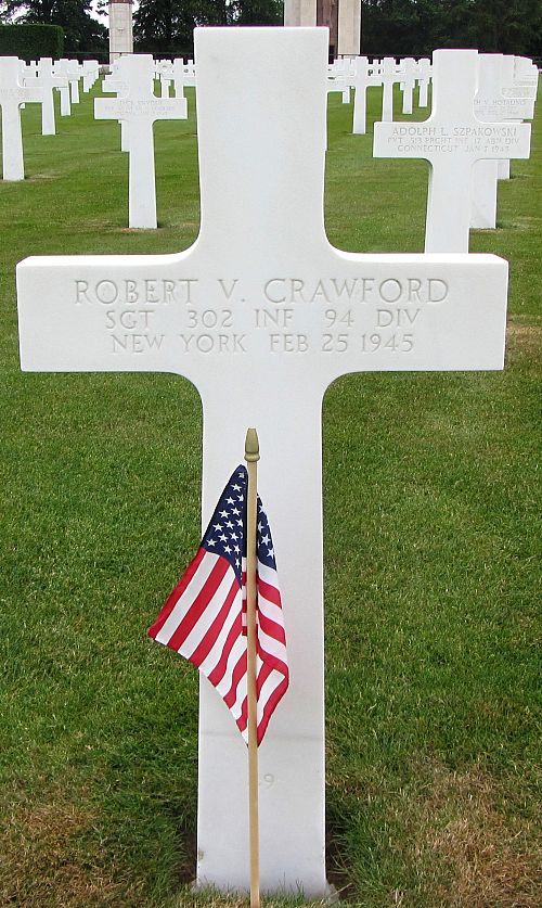 Sgt Robert V. Crawford enlisted in the National Guard in October, 1936 and was honorably discharged in October, 1939. He reenlisted in New York City, New York on 10 December 1942.Source of information: Peter Schouteten, www.abmc.gov, www.wwiimemorial.com, www.archives.gov – WWII Enlistment Record, www.ancestry.com - Headstone and Interment Record / New York National Guard Service Cards, http://www.94thinfdiv.com