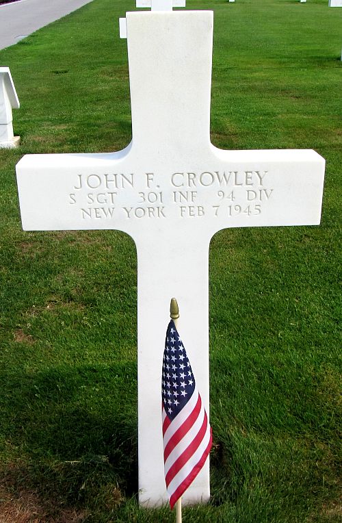 S/Sgt John F. Crowley attended 1 year of college and was a checker before he enlisted in New York City, New York, on 10 December 1942.Source of information: Peter Schouteten, www.abmc.gov, www.wwiimemorial.com, www.archives.gov – WWII Enlistment Record, www.ancestry.com - Headstone and Interment Record, http://www.94thinfdiv.com, www.findagrave.com – 142Genealogy