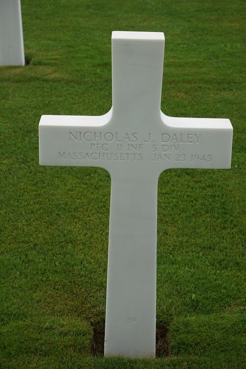 Pfc Nicholas J. Daley was employed as foreman at A. C. Lawrence Leathers, a division of Swift & Company.He enlisted at Fort Devens, Massachusetts on 9 March 1944.