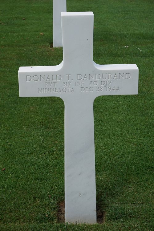 Pvt Donald T. Dandurand worked on the family farm before he enlisted on 30 June 1942.Source of information: Leo Minne, www.abmc.gov, www.wwiimemorial.com, www.ancestry.com – 1930/1940 Census / U.S. Headstone and Interment Record / U.S. Draft Cards Young Men / Minnesota Birth Index / Mark and Jean Carter Family Tree, www.80thdivision.com
