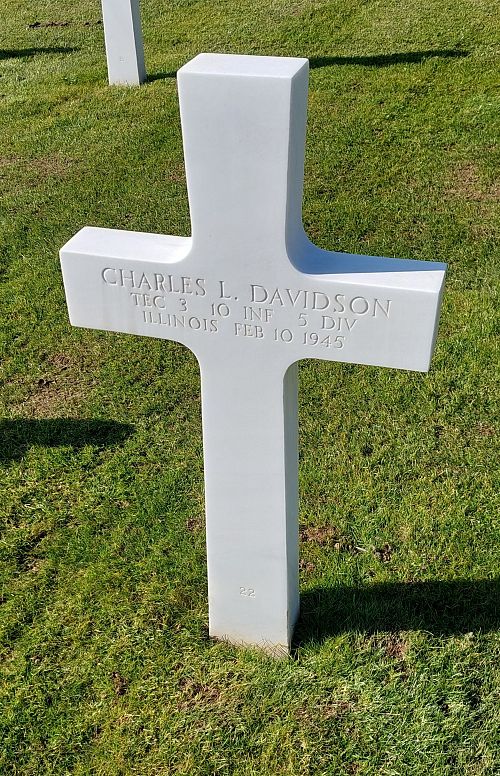 T/3 Charles L. Davidson graduated from Bloomington High School in 1939 and was a hospital attendant.He joined the Regular Army in Peoria, Illinois on 13 December 1940. He trained at Camp Grant, Camp McCoy and Camp Ellis and was sent overseas in April 1944.