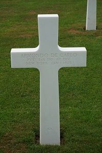 Pvt Armondo De Carlo attended Vocational High School and college for three years before he enlisted in Albany, New York on 18 November 1942.He was first buried at the Temporary American Military Cemetery in Grand Failly, France.