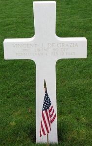 Pfc Vincent J. De Grazia attended high school for four years and was a printer, employed by the Republic Bank and Note Company, before he enlisted in Pittsburgh, Pennsylvania on 5 July 1944. He was sent overseas on 11 December 1944.He was killed by artillery shell fragments in the face.