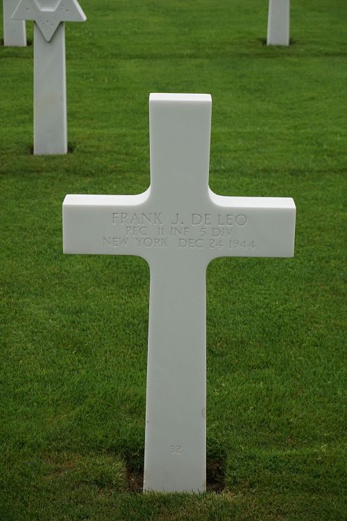 Pfc Frank J. De Leo was a salesman before he joined the Regular Army in New York City, New York on 27 August 1940.Source of information: Leo Minne, www.abmc.gov, www.wwiimemorial.com, www.archives.gov – WWII Enlistment Records, www.ancestry.com - 1920/1930/1940 Census / U.S. Headstone and Interment Record, www.findagrave.com, A footsoldier for Patton / Michael C. Bilder James G. Bilder, The 5th Infantry Division in the ETO