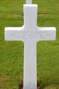 Pvt Charles E. Farris attended high school for four years. He had been working in retail management before he enlisted on 19 Jul 1943 in Roanoke, Virginia.Source of information: Peter Schouteten, Terry Hirsch, www.wwiimemorial.com, www.archives.gov, www.7tharmddiv.org, www.ancestry.com - Virginia Birth Records / 1920/1940 Census / United States World War II Army Enlistment Records