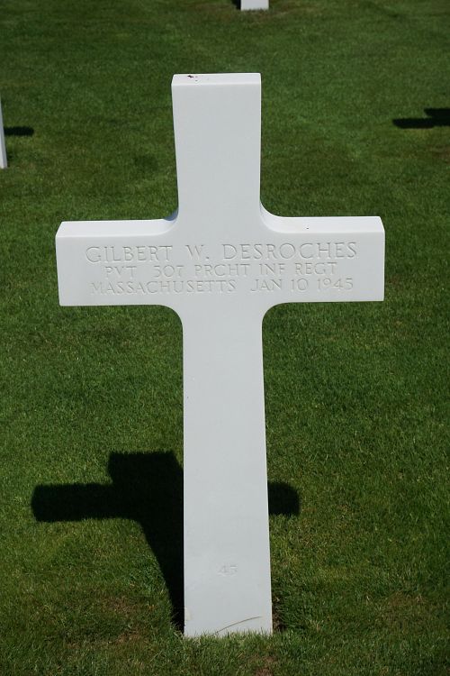 Source of information: Peter Schouteten, www.abmc.gov, www.wwiimemorial.com, www.archives.gov, www.ancestry.com - Headstone and Interment Record / Russell Desroches Family Tree / 1930 Census / U.S. WWII Hospital Admission Card Files, www.findagrave.com – Bruce Weirauch, www.ww2-airborne.us