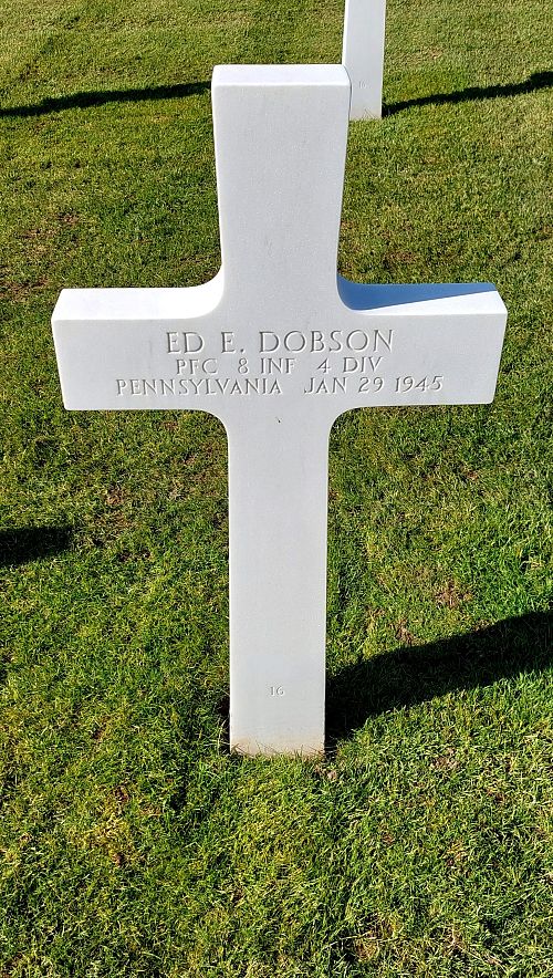 Pfc Ed E. Dobson was a lumberman before he enlisted in Erie, Pennsylvania on 31 August 1942.Source of information: Peter Schouteten, Danny van der Groen - Company's / 4ID After Action Reports, www.abmc.gov, www.wwiimemorial.com, www.archives.gov - WWII Enlistment Record, www.ancestry.com - Headstone and Interment Record / Pennsylvania Veteran Compensation Application Files WWII / 1930 Census / Peters Williams Family Tree, www.findagrave.com
