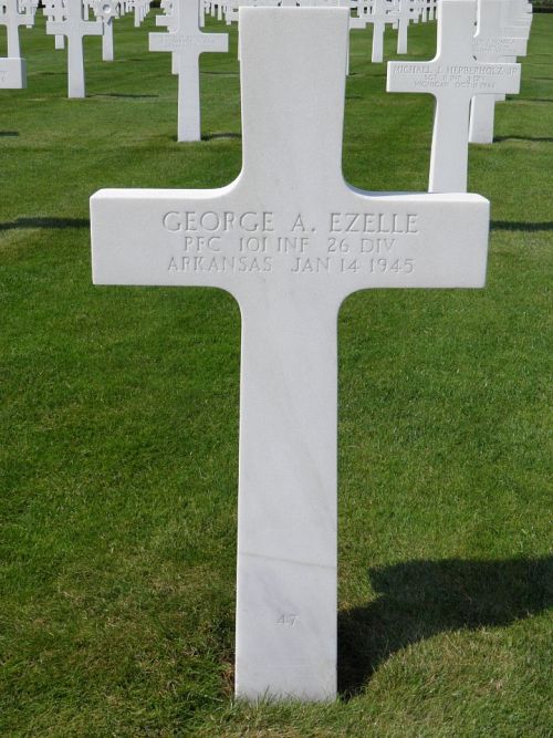 Pfc George A. Ezelle was a painter apprentice before he enlisted.Source of information: Peter Schouteten, www.abmc.gov, www.wwiimemorial.com, www.ancestry.com - Headstone and Interment Record / U.S. WWII Draft Cards Young Men / Harris & Johnson Tree / 1940 Census, www.fold3.com - 26th Infantry Division