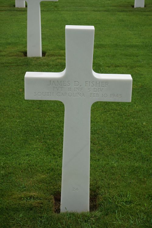Pvt James D. Fisher enlisted at Camp Croft, South Carolina on 29 November 1943. He worked in a textile production factory before he enlisted.Source of information: Leo Minne, www.abmc.gov, www.wwiimemorial.com, www.archives.gov - WWII Enlistment Record, www.ancestry.com - Headstone and Interment Record / 1930/1940 Census, A footsoldier for Patton / Michael C. Bilder James G. Bilder, The 5th Infantry Division in the ETO