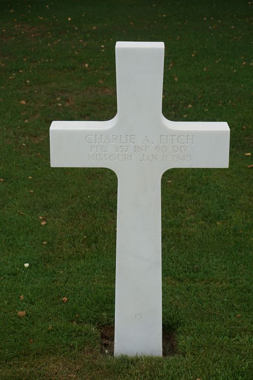 Pfc Charlie A. Fitch enlisted at Jefferson Barracks, Missouri on 8 September 1943.Source of information: Peter Schouteten, www.abmc.gov, www.wwiimemorial.com, www.archives.gov – WWII Enlistment Record, www.ancestry.com - Headstone and Interment Record / U.S. WWII Draft Cards Young Men / 1930/1940 Census, www.findagrave.com, https://standwheretheyfought.jimdo.com/ardennes-2015-the-southern-flank-of-the-battle-of-the-bulge-the-battle-for-sonlez-and-the-sonlez-mill-january-11-1945-then-and-now/