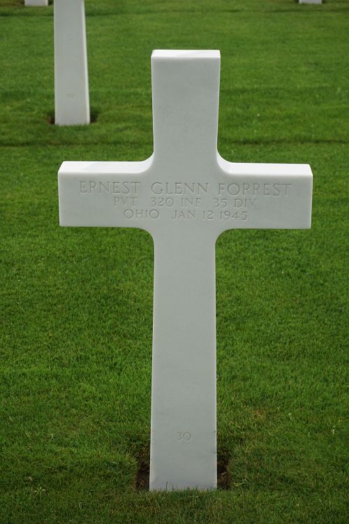 Pvt Ernest G. Forrest attended high school for two years before he enlisted at Fort Benjamin Harrison, Indiana on 23 June 1944.Source of information: Peter Schouteten, www.abmc.gov, www.wwiimemorial.com, www.archives.gov - WWII Enlistment Record, www.ancestry.com - Headstone and Interment Record / U.S. WWII Draft Cards Young Men / Schreiber Kuechl Family Tree / Ohio County Marriage Records, After Action Report 35th Infantry Division, www.findagrave.com - Edward Boeh