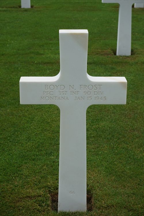 Pfc Boyd N. Frost enlisted in May 1943 and was sent overseas in May 1944.Source of information: Peter Schouteten, www.abmc.gov, www.wwiimemorial.com - Lucille Evelyn Williams, www.ancestry.com - Headstone and Interment Record / 1930/1940 Census, www.findagrave.com - Marian, www.newspapers.com - Great Falls Tribune Montana - 2 February 1945