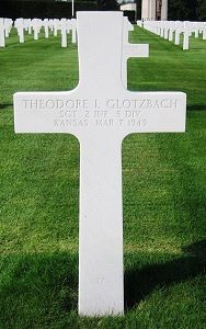 At the time of his death the 2nd Infantry Regiment was engaged in the fighting in the vicinity of Eisenschmitt, East of Bitburg, Germany. The exact date when Sgt Glotzbach was reported wounded in action and the location where he died is not known.Sgt Theodore I. Glotzbach is remembered at Sacred Heart Catholic Cemetery in Newbury, Wabaunsee County, Kansas with a memorial marker.