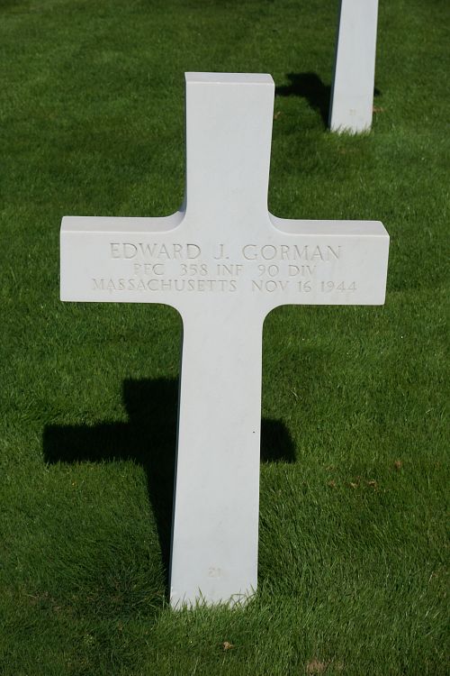 Pfc Edward J. Gorman graduated from Newton High School before he joined the U.S. Army Reserve at Fort Devens, Massachusetts on 8 October 1943.Source of information: Peter Schouteten, Terry Hirsch, www.abmc.gov, www.wwiimemorial.com, www.archives.gov - WWII Enlistment Record, www.ancestry.com - Headstone and Interment Record / 1930 Census, Sacramental Records, Boston Archdiocese
