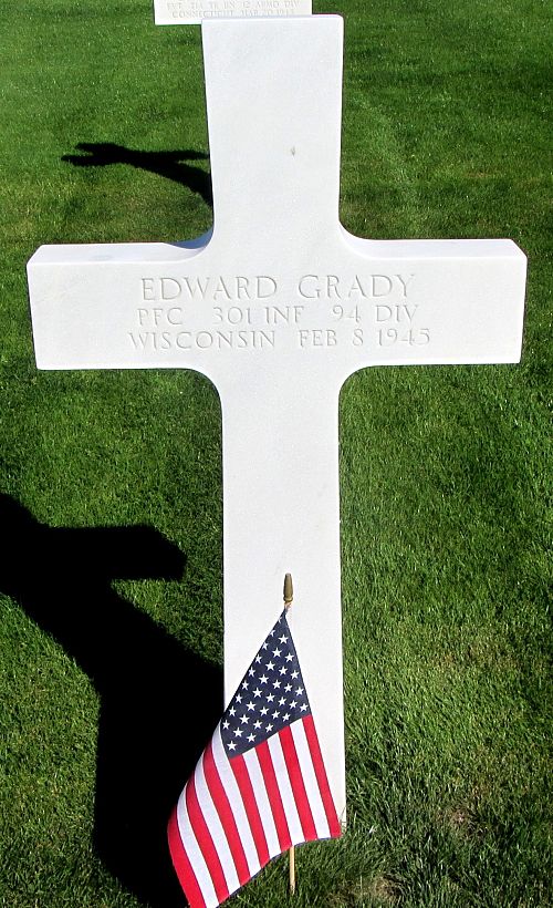 Pfc Edward Grady graduated from West High School in 1943 and was employed at the Calvary Cemetery.He enlisted in Milwaukee, Wisconsin, on 20 September 1943 and was selected for the Army Specialized Training Program (A.S.T.P.) and studied at Fort Benning. He was sent overseas in June 1944.