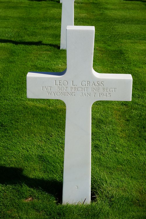 Pvt Leo L. Grass worked on a farm before he enlisted at Fort Logan, Colorado on 23 March 1944.He was first buried at the Temporary American Military Cemetery in Grand-Failly, France.