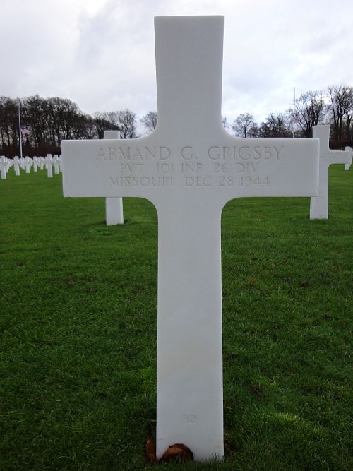 Pvt Armand G. Grigsby attended high school for four years before he enlisted at Jefferson Barracks, Missouri on 24 February 1943.He was killed by artillery shell fragments in his stomach.
