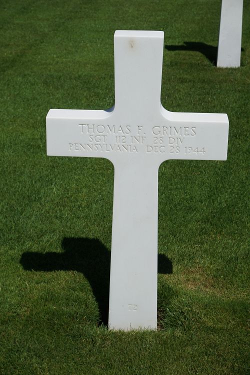 Sgt Thomas F. Grimes was a shipping and receiving clerk before he enlisted in Philadelphia, Pennsylvania on 19 April 1941.According to German records, Sgt Grimes was taken prisoner and died in Feldlazarett 257 of a head shot wound. This German field hospital was stationed in the schoolhouse of Büdesheim/Eifel, Germany at that time. He was initially buried at the local cemetery.