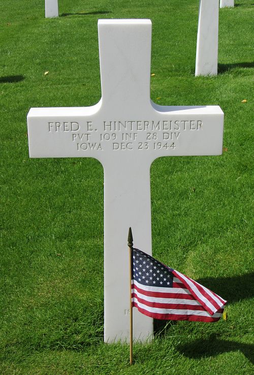 Pvt Fred E. Hintermeister attended high school for four years and worked on a farm before he enlisted at Camp Dodge Herrold, Iowa on 18 January 1944. He was sent overseas in August 1944.He was first buried at the Temporary American Military Cemetery in Grand Failly, France.