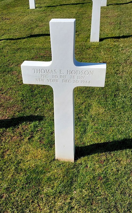 Pfc Thomas E. Hodson enlisted in Albany, New York on 1 December 1943. He was wounded in action on 10 August 1944 and recovered at a medical station in England.Source of information: Peter Schouteten, www.abmc.gov, www.wwiimemorial.com, www.archives.gov - WWII Enlistment Record, www.ancestry.com - Headstone and Interment Record / Indiana Birth Certificates / Bovia Family Tree, www.findagrave.com