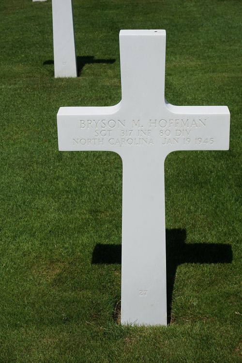 Sgt Bryson M. Hoffman attended high school for four years and worked on a farm before he enlisted at Fort Bragg, North Carolina on 18 March 1944.Sgt Hoffman was killed when he was trying to make his foxhole deeper.