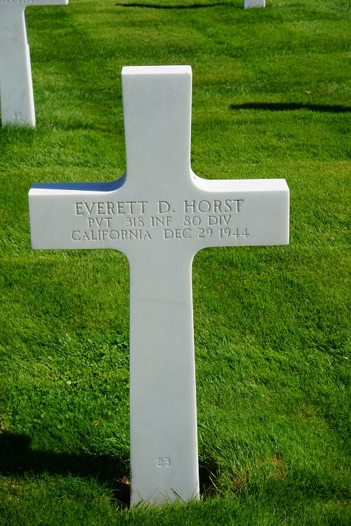 Pvt Everett D. Horst was employed by the Modesto State Theaters Inc. when he was drafted on 13 July 1941.Source of information: Leo Minne, www.abmc.gov, www.wwiimemorial.com, www.ancestry.com – 1930/1940 Census / U.S. Headstone and Interment Record / U.S. WWII Hospital Admission Card Files / U.S. Draft Cards Young Men, www.80thdivision.com