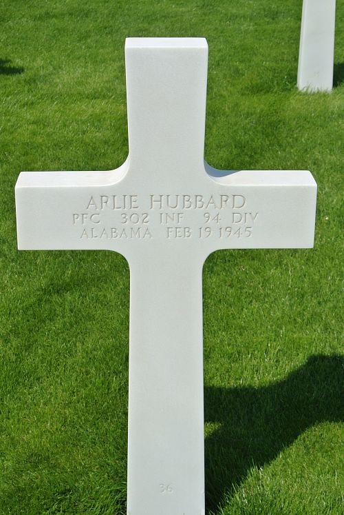 Pfc Arlie Hubbard worked on a farm before he enlisted in Fort McClellan, Alabama, on 29 September 1942.Source of information: Peter Schouteten, www.abmc.gov, www.wwiimemorial.com, www.archives.gov – WWII Enlistment Record, www.ancestry.com - Headstone and Interment Record, http://www.94thinfdiv.com