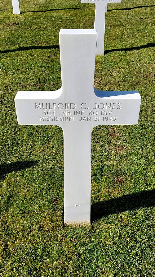 Sgt Mulford C. Jones was a sales clerk before he enlisted at Camp Shelby, Mississippi on 6 April 1944.He was awarded the Bronze Star for heroic achievement in Belgium on 26 December 1944. The citation reads in part: "On the night of 26 December 1944, Sgt Jones, assistant squad leader as a member of a patrol, penetrated enemy infested woods to reach the town of Bastogne, Belgium, held by besieged American forces. Improvising camouflaged clothing from white parachutes, to blend with the weather conditions, he went through active enemy machine gun positions and greatly assisted in securing vital information from the headquarters of the besieged troops and returned safely to the battalion he served."