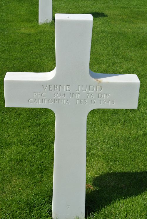 Pfc Verne Judd graduated from Santa Monica High School in 1935 and attended Santa Monica Junior College. He was employed at the Douglas Aircraft Company in Santa Monica.He enlisted in Los Angeles, California on 19 November 1942. He was selected for the Army Specialized Training Program (A.S.T.P.) and studied engineering at the Michigan School of Mining and Technology in Houghton, Michigan. When the program was discontinued he was transferred to the infantry and trained at Camp McCoy, Wisconsin. He was sent overseas in November 1944.