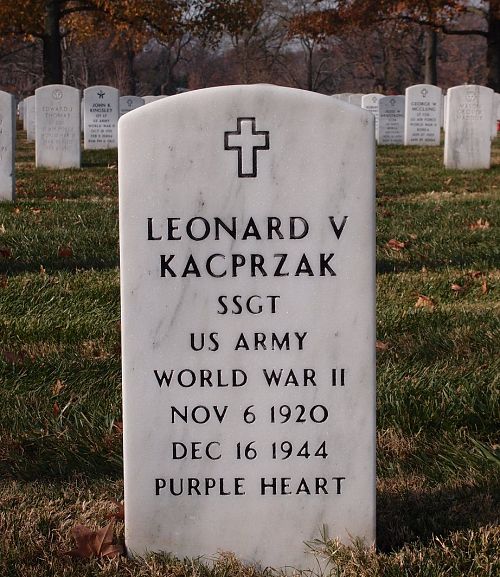 S/Sgt Kacprzak's remains were recovered and identified on 10 February 2003. He was given his final resting place at Arlington National Cemetery, Virginia on 30 April 2004.Source of information: Peter Schouteten, www.abmc.gov, www.wwiimemorial.com, www.ancestry.com - 1930/1940 Census, www.findagrave.com - John C. Anderson, http://112th-infantry.blogspot.com/p/honor-roll-of-fallen.html