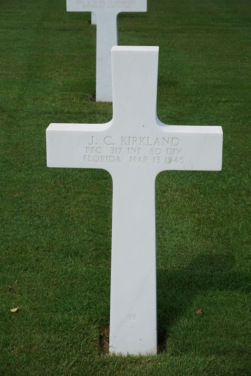 Pfc J.C. Kirkland enlisted on 14 February 1942.Source of information: Leo Minne, www.abmc.gov, www.wwiimemorial.com, www.ancestry.com – 1930/1940 Census / U.S. Headstone and Interment Record, www.80thdivision.com