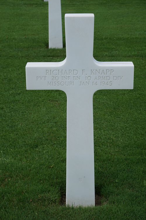 Pvt Richard F. Knapp was first buried at the Temporary American Military Cemetery in Grand-Failly, France.Source of information: Peter Schouteten, www.abmc.gov, www.wwiimemorial.com – The Knapp Family, www.ancestry.com - Headstone and Interment Record / U.S. WWII Draft Cards Young Men / Diann Knapp Master Ancestry File / 1940 Census, www.10tharmored.com
