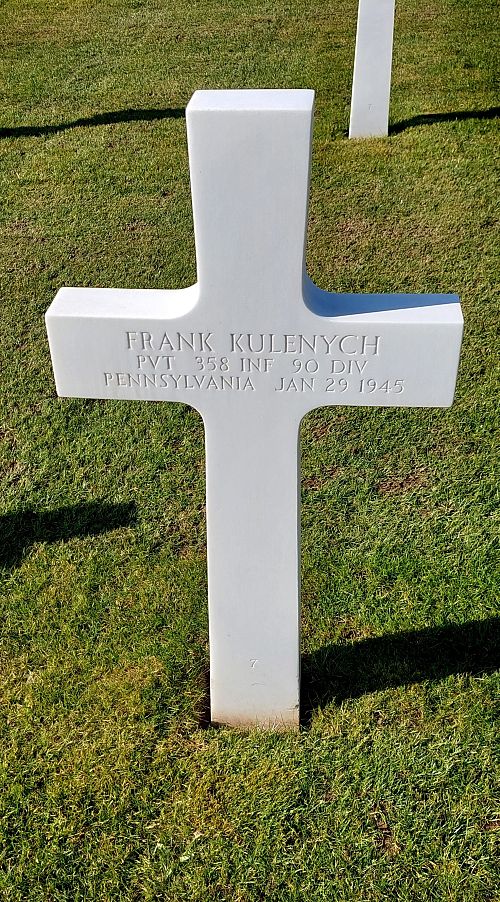 Pvt Frank Kulenych attended high school for 4 years before he enlisted in Wilkes Barre, Pennsylvania on 12 July 1944.He is remembered at the Saint Michaels Ukrainian Orthodox Church Cemetery in Taylor, Lackawanna County, Pennsylvania.