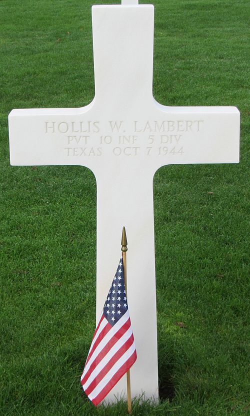 Pvt Hollis W. Lambert entered the service on 9 December 1943 at Fort Sill, Oklahoma. He was employed at Pitcher Dairy.Source of information: Leo Minne, Terry Hirsch, www.abmc.gov, www.wwiimemorial.com, www.archives.gov – WWII Enlistment Record, www.ancestry.com - 1930 Census / U.S. Headstone and Interment Record, WWII Draft Card, Abilene Reporter-News - 17 November 1944