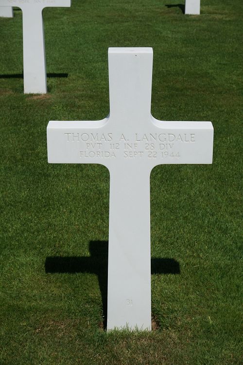 Pvt Thomas A. Langdale worked on a farm before he enlisted at Camp Blanding, Florida on 22 April 1943.Source of information: Peter Schouteten, www.abmc.gov, www.wwiimemorial.com, www.archives.gov – WWII Enlistment Record, www.ancestry.com - Headstone and Interment Record / 1940 Census / Florida County Marriage Records / U.S. Social Security Applications and Claims Index, www.findagrave.com
