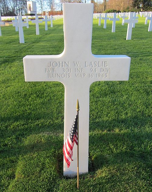 Pvt John W. Laslie Jr. is buried next to his brother Pfc Jefferson Laslie who was killed in action in France.Source of information: Peter Schouteten, www.abmc.gov, www.wwiimemorial.com, www.ancestry.com - Headstone and Interment Record / Farrar Family Tree / 1930/1940 Census, http://www.94thinfdiv.com, www.findagrave.com – Doc Wilson