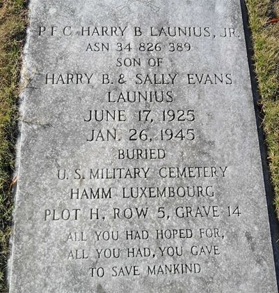 Pfc Harry B. Launius Jr. attended college before he enlisted in Fort McPherson Atalanta, Georgia on 30 July 1943.He is remembered at the Rest Haven Cemetery in Monroe, Walton County, Georgia.