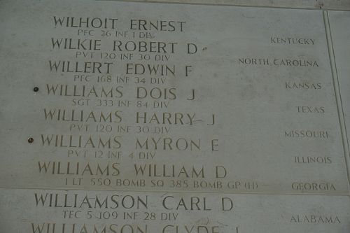 His company entered a wooded area that had been heavily mined and booby-trapped, and then found itself under heavy mortar and artillery fire. When the company witdrew from the miniefield, Pvt Williams was missing. Battle conditions made it impossible to search for Pvt Willams at the time and he was never reported to be a prisoner of war. Attempts to locate his remains following the ware were unsucessful.